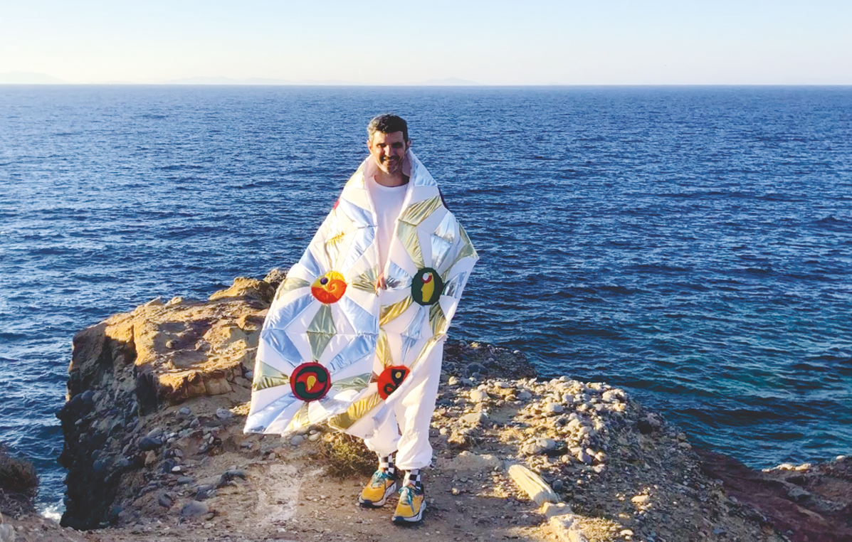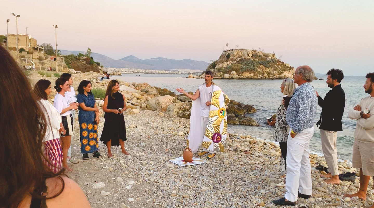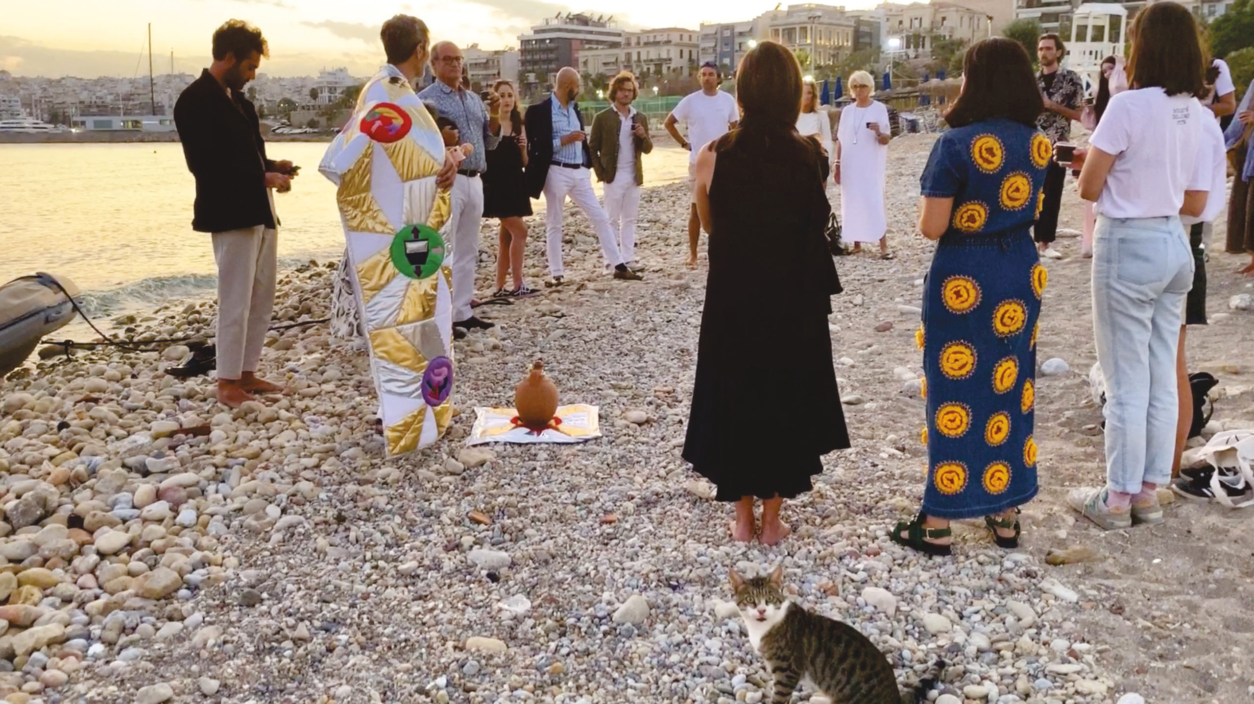 At the end of the cruise, on September 27th, a ritual happened on the beach of Votsalakia (Pireas River Beach—Athens) with the offering of a talismanic drinkable elixir part of the project A scene of a Blossom Head—a special commission Angelo Plessas had for the boat. While doing the ritual, Angelo Plessas wore a hand-made quilted vestment with special fabrics which function as Electromagnetic field “protectors.” The drink was made and conceived specifically for this purpose and made from natural elements that the artist collected from the uninhabited islands.