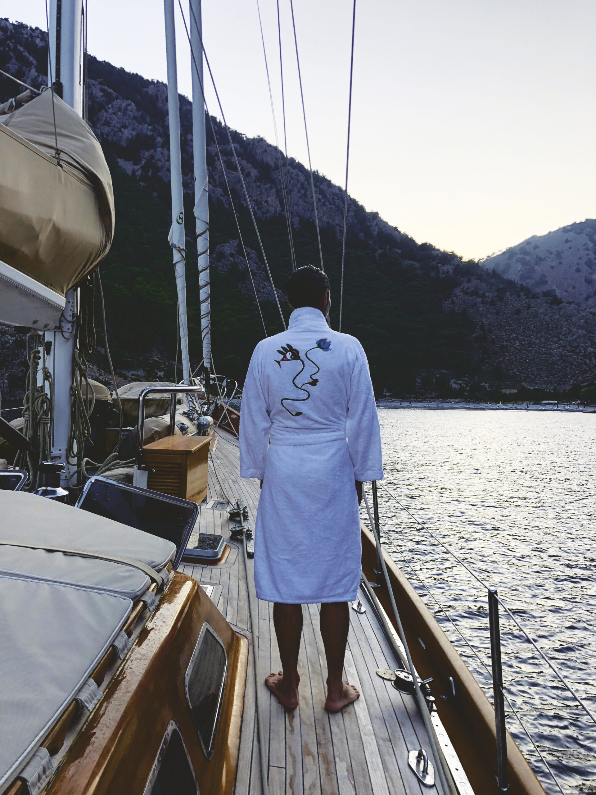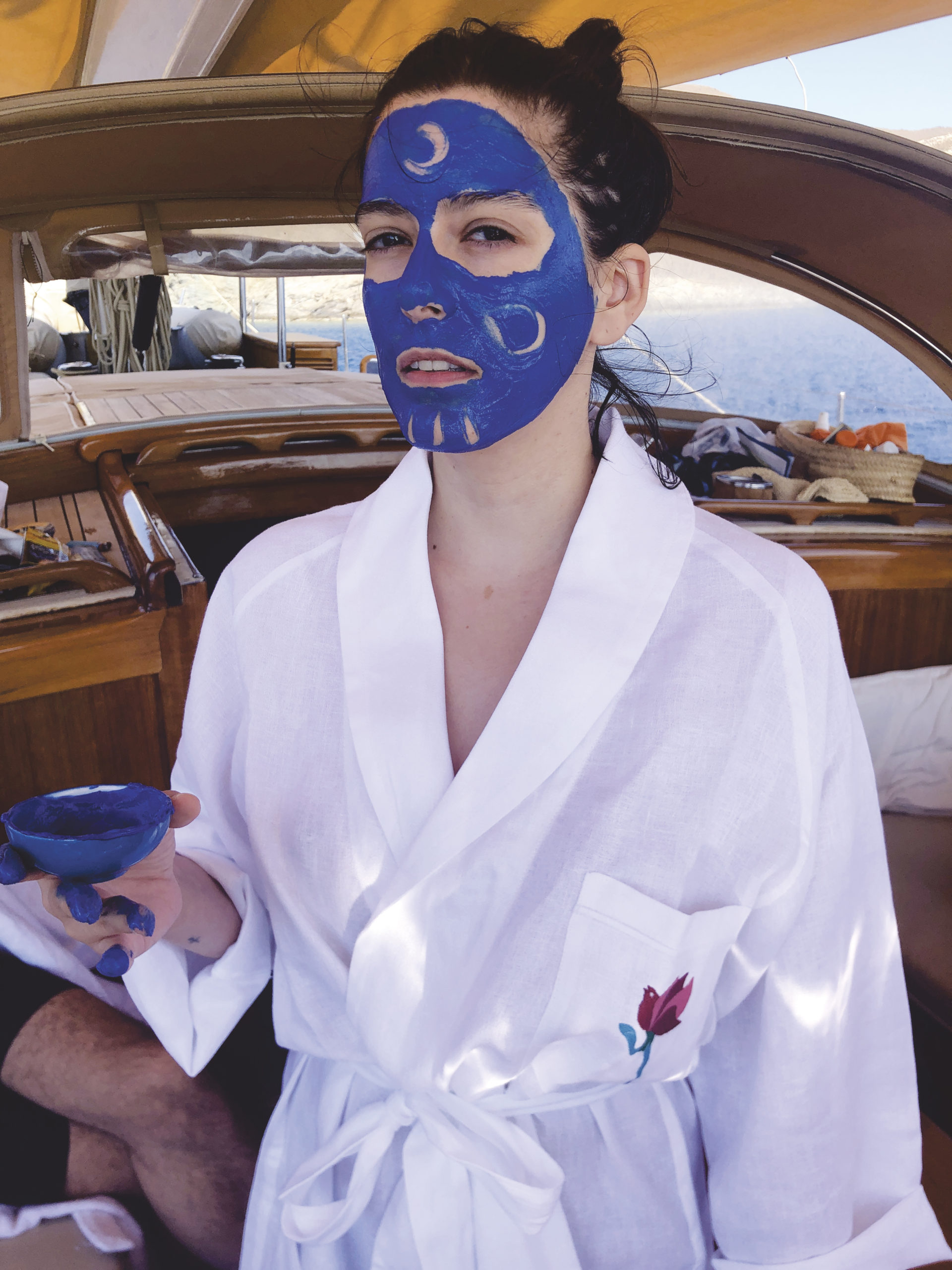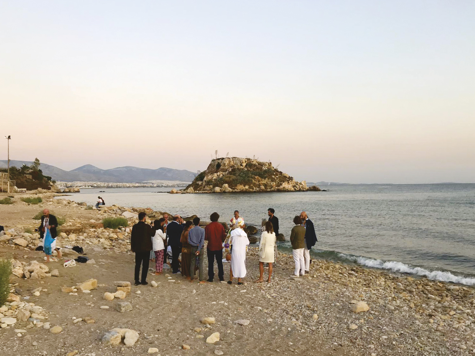 At the end of the cruise, on September 27th, a ritual happened on the beach of Votsalakia (Pireas River Beach—Athens) with the offering of a talismanic drinkable elixir part of the project A scene of a Blossom Head—a special commission Angelo Plessas had for the boat. While doing the ritual, Angelo Plessas wore a hand-made quilted vestment with special fabrics which function as Electromagnetic field “protectors.” The drink was made and conceived specifically for this purpose and made from natural elements that the artist collected from the uninhabited islands.