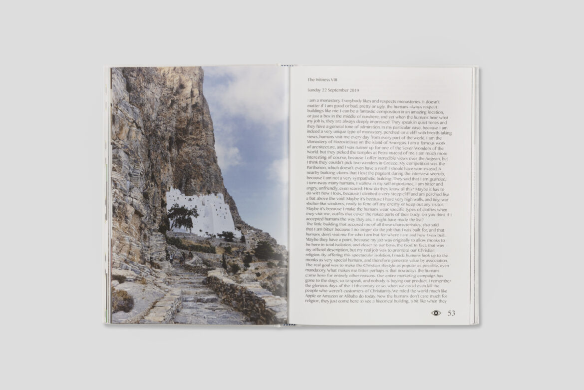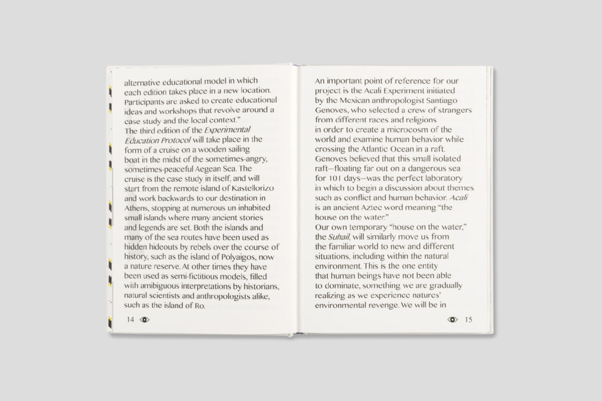 The book presents works from the third edition of The Experimental Education Protocol. Founded by artist Angelo Plessas, The Experimental Education Protocol is an alternative educational model in which each edition takes place in a different location and participants are asked to create educational ideas and workshops that focus on a particular case study and its local context. The third edition (17–27 September 2019) took place in the form of a cruise on a classic sailboat, called Suhail, put at the artist’s disposal by Silvia Fiorucci, a “house on the water” that brought the participants within new and different situations, allowing them to be temporarily detached from the outside world and to connect directly with the natural environment. Organized by Società delle Api, the cruise covered a journey in the Aegean Sea from Kastellorizo to Athens, stopping at numerous un-inhabited small islands. The participants (artist Andreas Angelidakis; curators/publishers Marina Fokidis and Luca Lo Pinto; artist Sofia Stevi; artist Amalia Vekri) used it as a case study to explore the surroundings and develop new types of learning relationships, considering the sea and nature in general as open-source, decentralized interfaces to be explored from spatial, environmental and social perspectives.