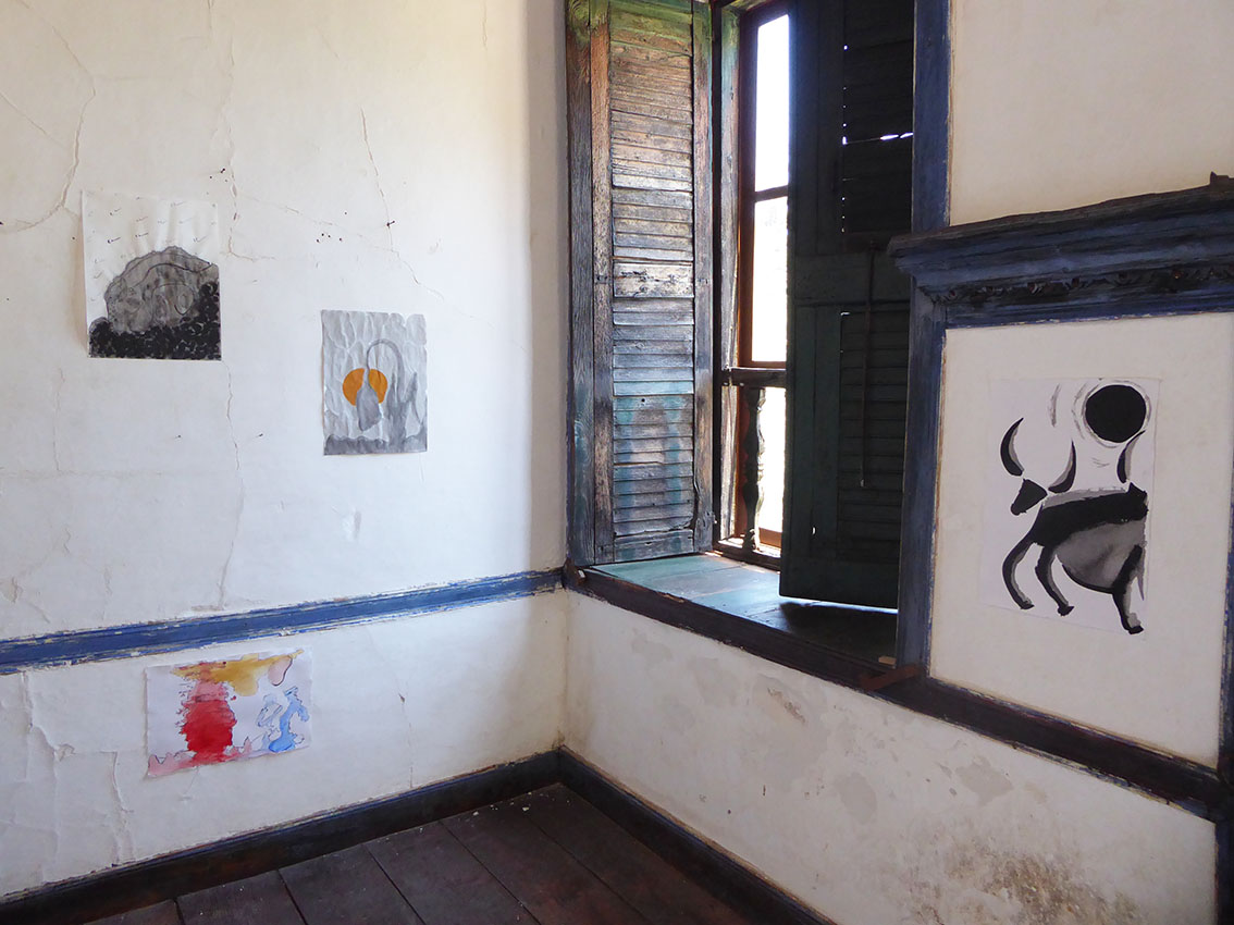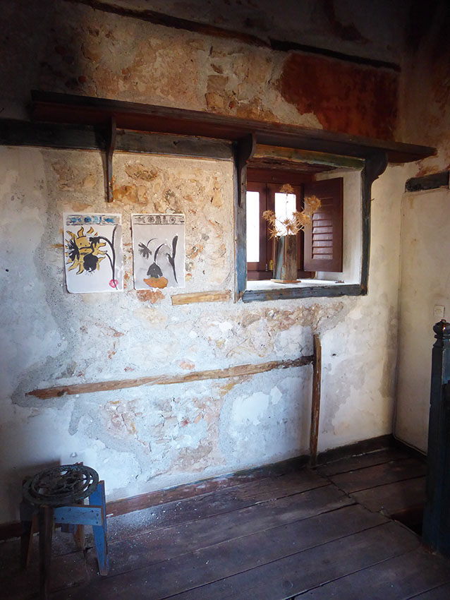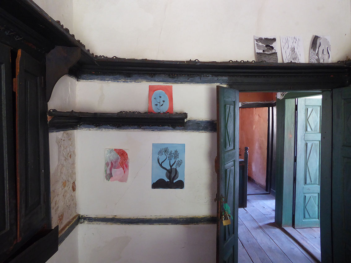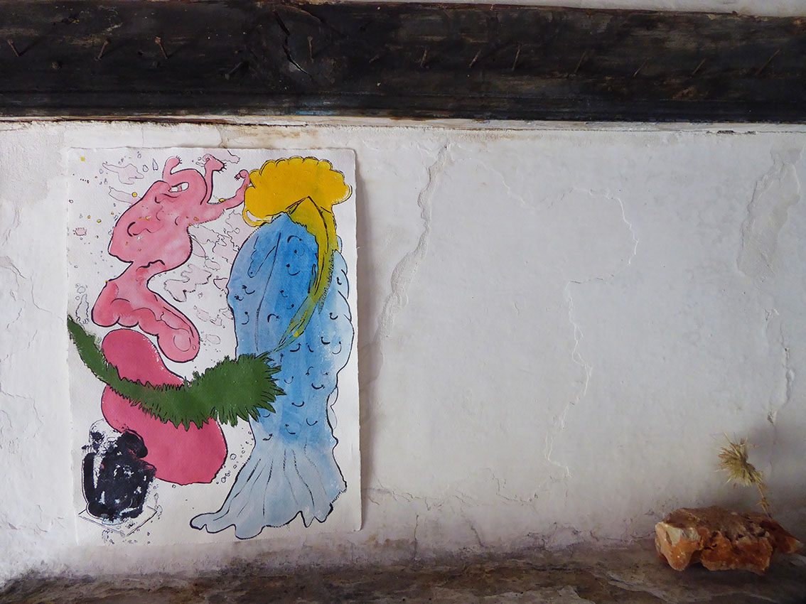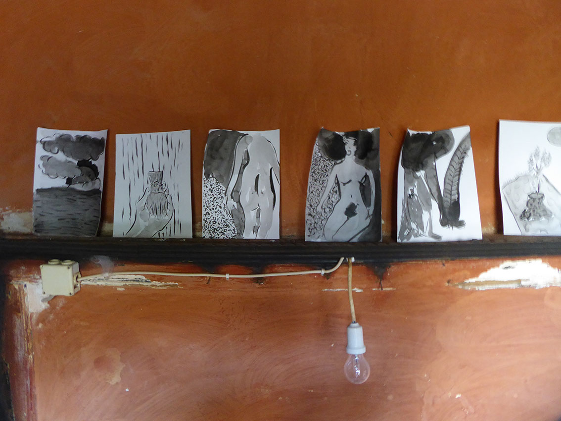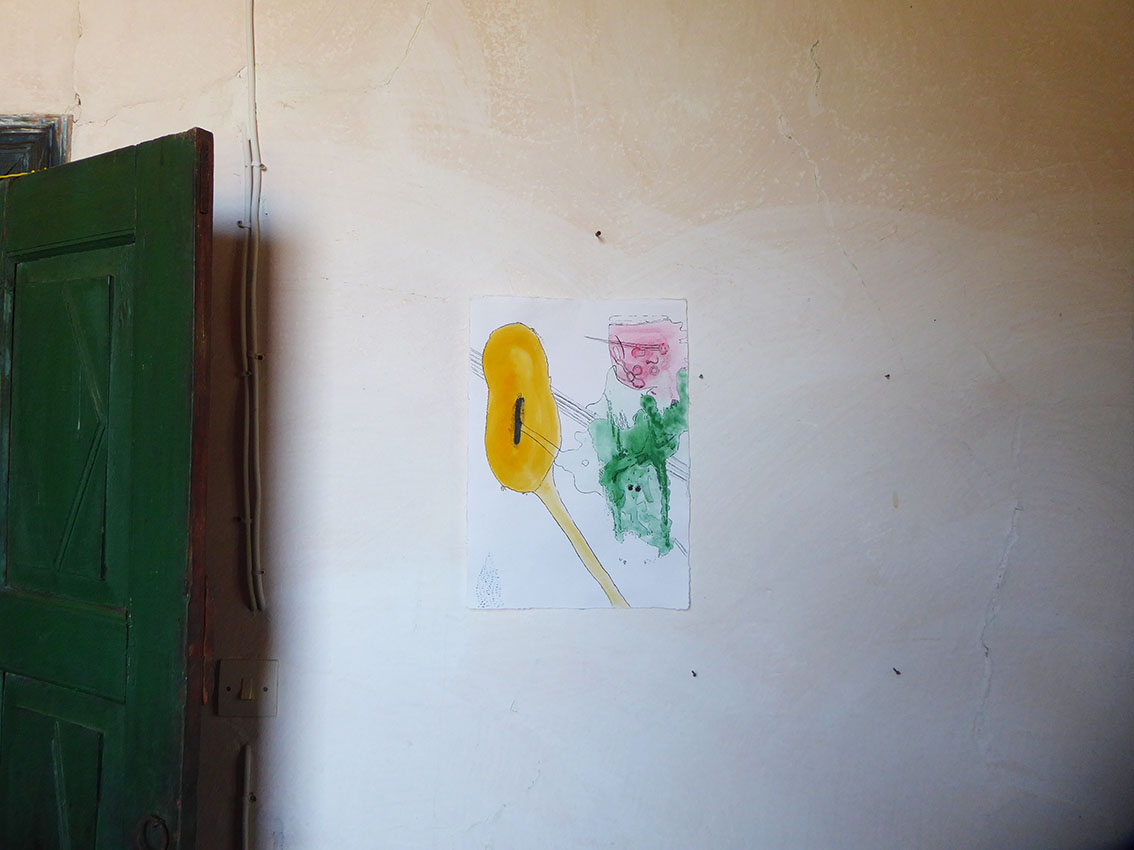 We arrived in the island on the first week of July. It was already a day since we left the busy port of Piraeus behind us. We took the twenty-three hour boat to arrive to our destination, a journey that is already an experience by itself. Arriving to the port of Kastellorizo by boat is magical. When the boat turns a protected little port full of colourful houses appears. The captain gives to the island a special hello with the horn. We arrived at the eastern borders of Greece, the most east part of Europe itself. It feels like the island is waiting for us and it take us only a few minutes to arrive to “PORTA ROSSA”, our residency for the month ahead. Having both, thanks to Silvia, visited the place before it feels like a reunion. We are here to read, to think, to make music and to draw. Giacomo made a small music studio at the second floor and Sofia decided to move her art supplies to the mysterious “CASA DELL’ULIVO”. The days were spent with swimming in the most transparent sea, reading literature and essays (Ueda Akinari, Mircea Eliade, James Frazer, Carl Gustav Jung, Nikolaos Politis) we had with us and talking about our ideas and solutions, cooking at the Porta Rossa kitchen and exploring the island. Giacomo made some first sounds, with the guitar and the keyboard. We came back with some direction. Also we made a lot of drawings, not all part of our project but it is impossible not to draw when you have such time and space. All these drawings became a small private exhibition in Casa Dell’Ulivo; being inspired by an object found in the Casa, we called it “THE CAULDRON AT THE END OF THE SEA”.