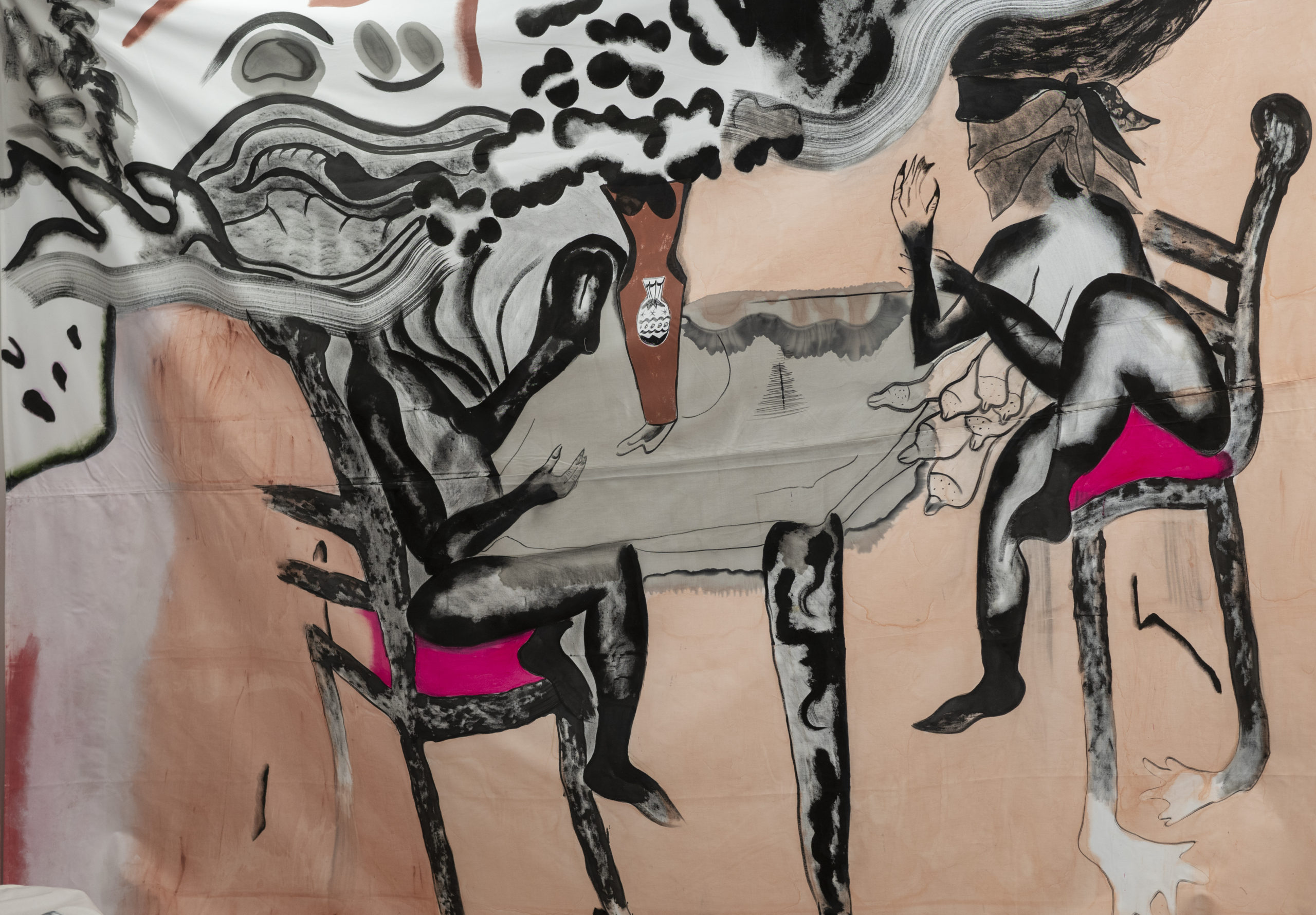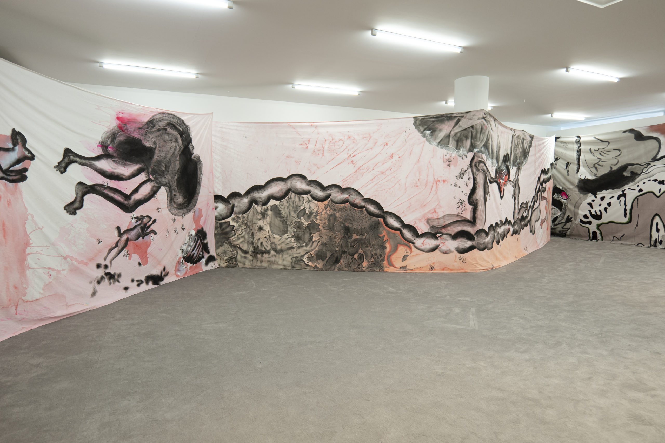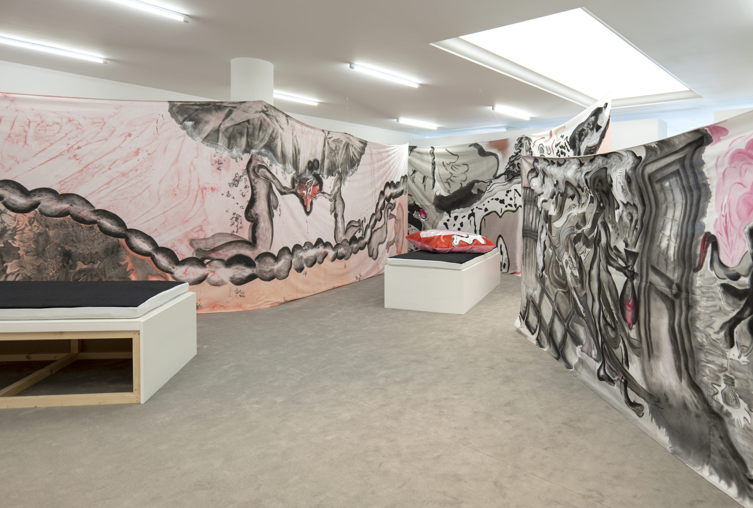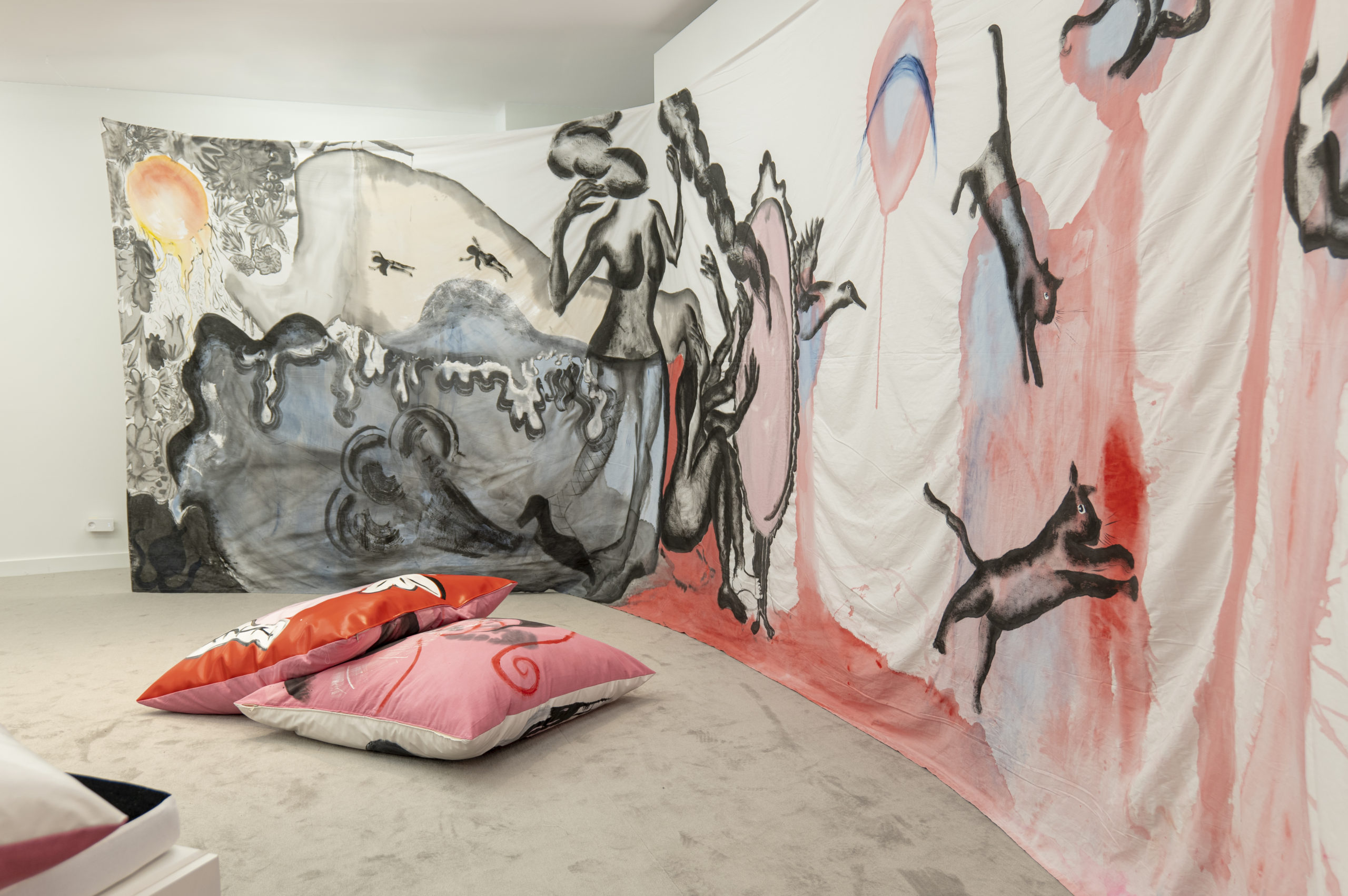 The exhibition consisted of several large paintings, hung directly on the wall and made with cotton fabrics. These large works, ranging from three to ten meters in length, are inspired by Japanese ukiyo-e prints, made in the Japanese city of Edo between the seventeenth and twentieth centuries, a period of wealth and peace, in which the art world was flourishing; Byzantine art and Greek culture are another important source of inspiration for these works (and part of the artist’s personal heritage): mythical, historical and fictional heroines such as Medea and Medusa appear through allegories, images and suggestions, giving life to dreamscapes where reality and fiction intertwine.